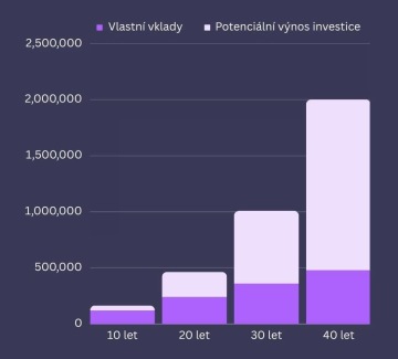 Investujeme-li například 1 000 Kč měsíčně při ročním zhodnocení 7 % po dobu 10 let před důchodem, budou vlastní peníze tvořit téměř ¾ cílové sumy. Když nám ale do důchodu zbývá 40 let, pak může při stejném ročním zhodnocení až ¾ koncové sumy tvořit výnos z vámi investovaných prostředků.