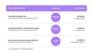 V penzijním připojištění (v transformovaných fondech) s průměrným ročním zhodnocením 1,13 % se nám za 30 let, během nichž budeme měsíčně odkládat 1 650 Kč, naakumuluje i se započtením státního příspěvku částka 853 000 Kč. Rentu 20 000 Kč měsíčně budeme moci čerpat jen necelé 4 roky.